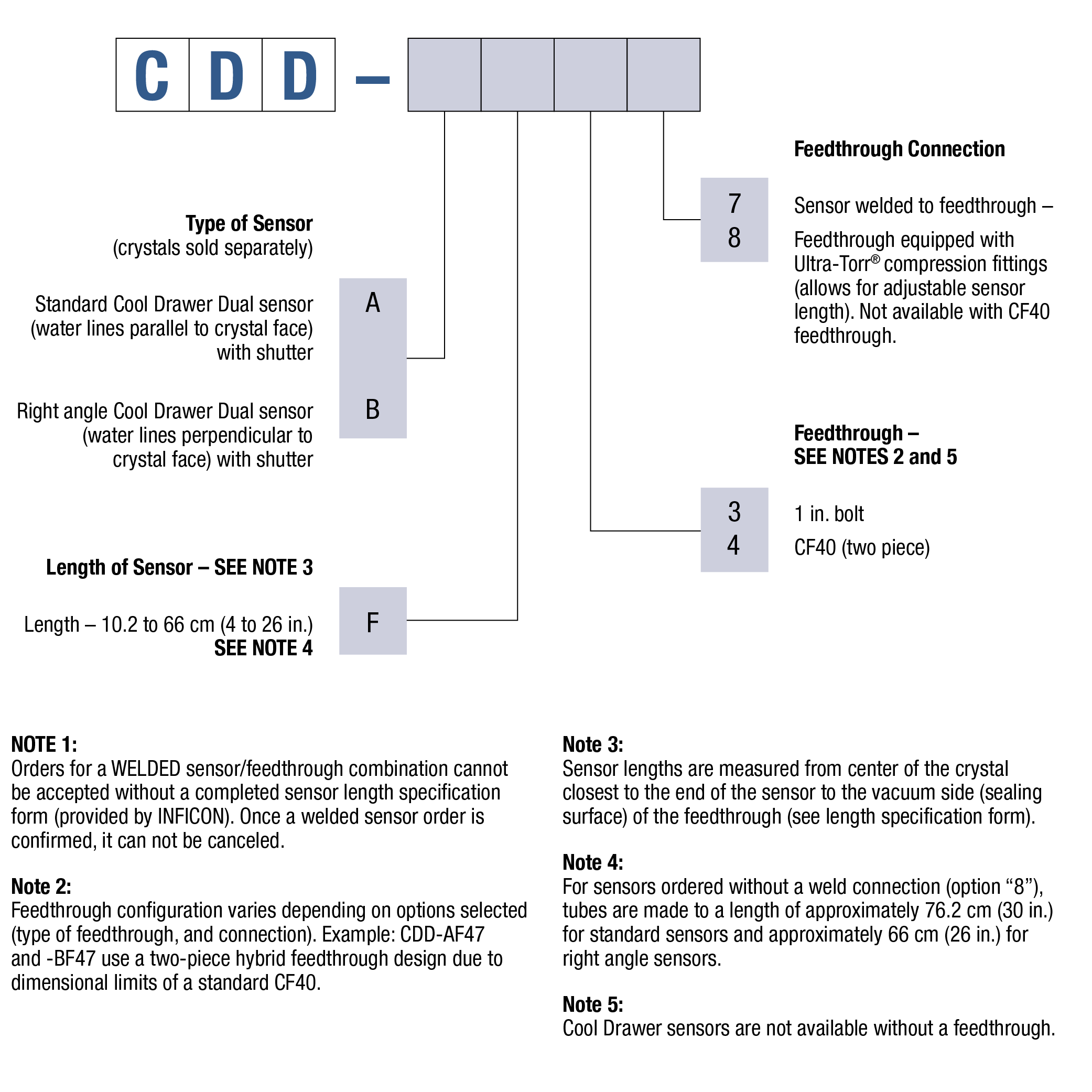 Finish : Stainless steel, gold plated Cool Drawer™ Cooling water : Minimum water flow of 150 to 200 cm³/min using 1/8 in. O.D. tube, 30°C max. (Do not allow to freeze) Crystal : Industry standard 0.550 in. diameter Air supply : 55 to 60 PSI regulated Electrical connection : Two standard female BNCs on atmosphere side 1 in. bolt and compression fitting sealed terminations Materials : 304 stainless steel, Teflon®, ceramic, beryllium nickel, VITON® Temperature : Operational environment to 300° C with water cooling or 165° C without Mounting : 1.015 in. ±0.010 in. diameter aperture CF 40 welded terminations Materials : 304 stainless steel, ceramic, beryllium nickel Temperature : Operational environment to 450° C with water cooling or 200° C without Mounting : Mates with 2 ¾ in. ConFlat® type flanges |