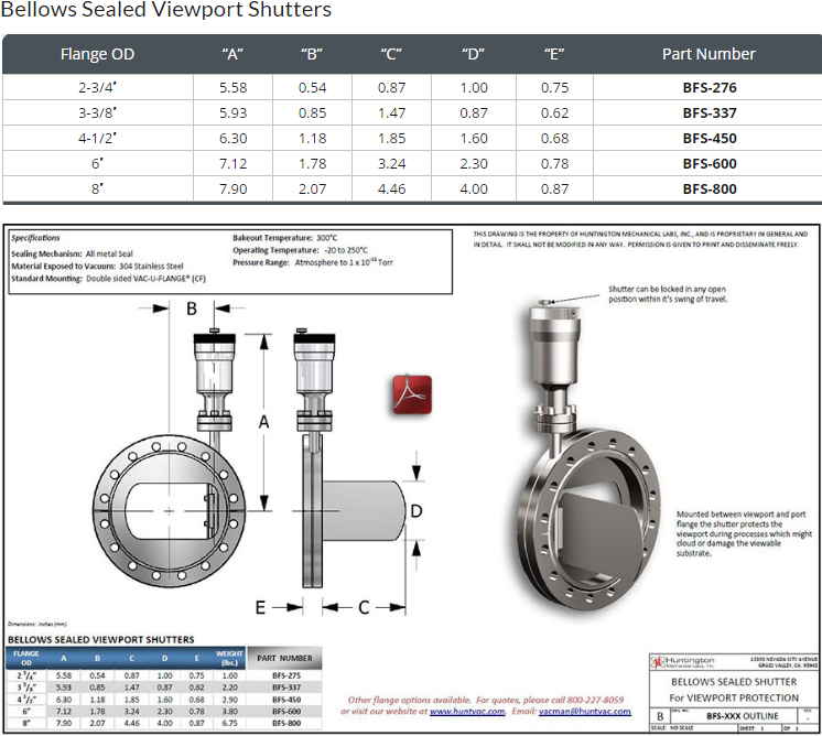 - Huntington Bellows Sealed Viewport Shutters are manually operated rotary shutter assemblies incorporated into a double sided VAC-U-FLANGE® flange. Viewport Shutters are critical to preserving the light transmission capabilities of viewports especially in vacuum coating applications where material can become deposited on the optical substrate. The Shutter can be locked in a closed position to prevent the buildup of material on the viewport glass, then opened for viewing after the process. It can also be locked in any open position in it’s swing of travel. Protect your investment in expensive or hard-to-replace viewports with Huntington Viewport Shutters.