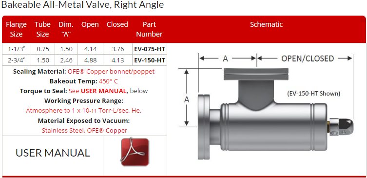 - "Huntington’s EV-HT Series Provides a High Integrity Copper Seal Even After Bakeout A reliable seal is guaranteed with Huntington’s cutting edge design for all metal bakeable valves. EV-HT series valves combine a high purity copper gasket and proprietary knife edge profile to provide a more versatile and longer lasting seal. EV-HT copper gaskets can be easily replaced with nothing more than a screwdriver once the valve is removed from service. The robust all-metal construction includes stainless steel bellows, thick wall body and TIG welded connections for a long service life. The 5/8″ hex nut attached to our anti-seize lead screw easily applies the sealing force needed with the help of a torque wrench. Entire Unit Bakeable The seal integrity of Huntington’s patented all metal valves is not affected by bakeout temperatures up to 450°C. When baked, the valves must be under vacuum to prevent oxide buildup on seal surfaces. EV-HT series valves have ample cycle life but are dependent on actual process parameters. Please contact customer service for more information."