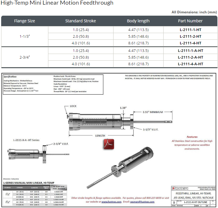 - Huntington’s L-Series Linear Motion Feedthroughs incorporate a unique modular design which accommodates three actuator options on two basic shaft/body configurations. Actuator options include manual, motorized and pneumatic versions. The High Temp version features all Stainless Steel construction. Each combination of body and actuator is available in three standard stroke lengths with special lengths available upon request.