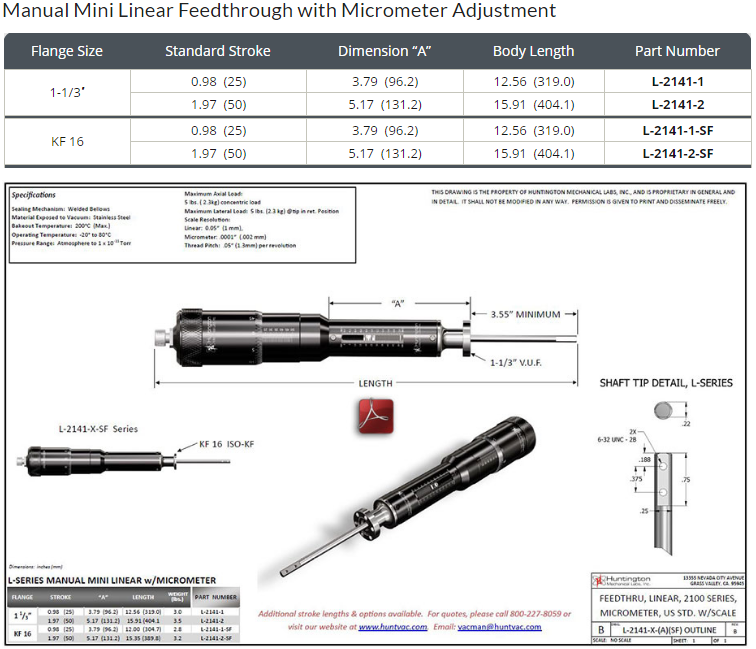- Huntington’s L-Series Pneumatic Mini Linear Motion Feedthroughs are available in two primary configurations: Standard body / Pneumatic actuator and available as special order a model featuring an Adjustable Travel Stop. Options include our most popular Solenoid and Position Switch kits.