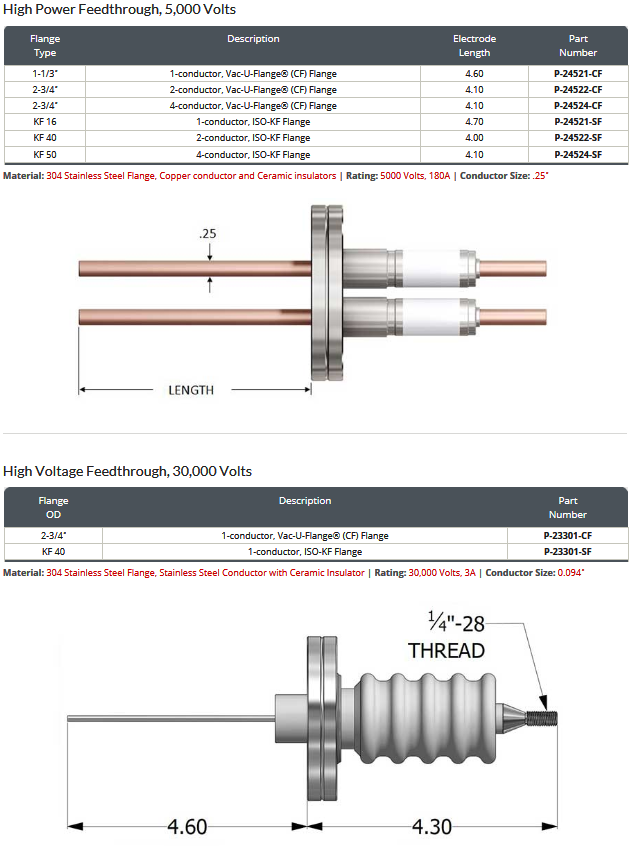 - Huntington offers a standard selection of High Power and High Voltage feedthroughs. Many other combinations of conductor, ratings and flange styles are available by special order.