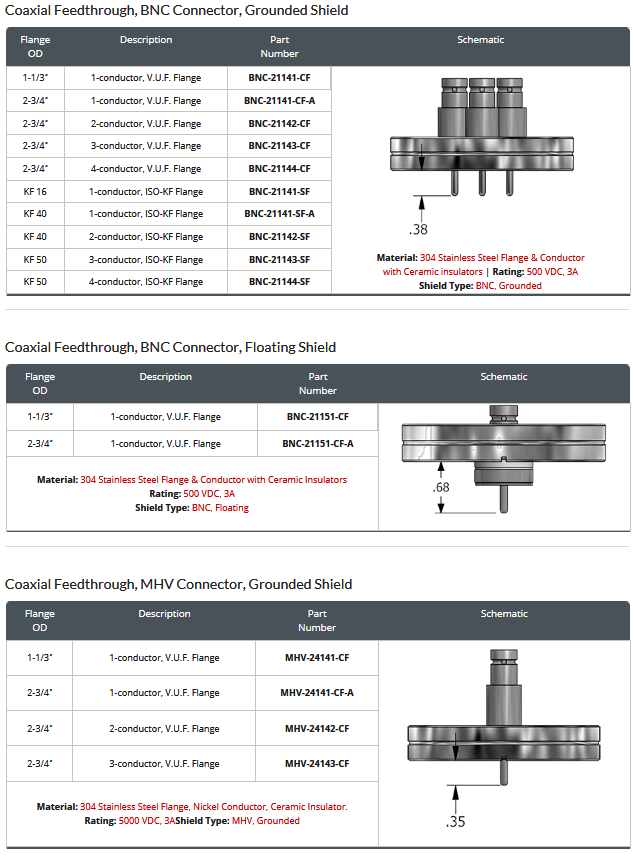 - Listings below feature our standard Coaxial Feedthroughs with BNC, MHV & SHV connectors in multiple conductor and flange styles.