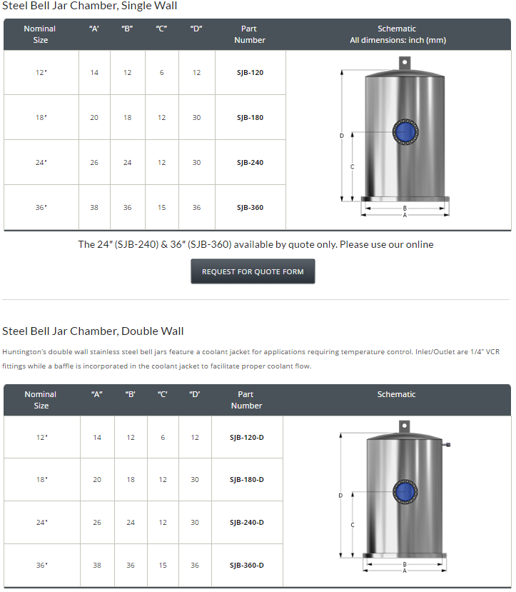 - Huntington Stainless Steel bell jar chambers feature a single viewport, lifting lug for easy transportability and an O-ring seal at the base for mounting to baseplate or base well of your choice. Bell jars are some of the simplest and most cost-effective chamber solutions available. Standard sizes shown, custom sizes and/or viewport configurations can be quoted upon request. Please call Technical Sales at 800-227-8059 or use the RFQ link below.