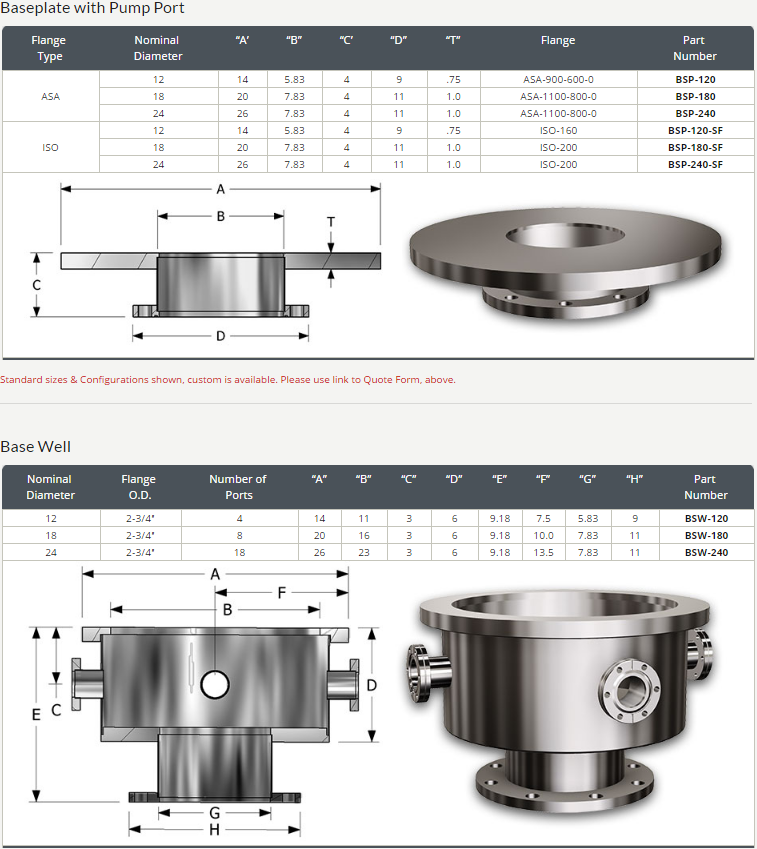 - Stainless Steel Baseplates and Base Wells for Vacuum Chambers Used primarily with Bell Jar Chambers, Huntington’s Baseplates and Basewells help to complete a chamber project based on the time-tested Bell Jar Chamber style. Standard designs are shown below or request a custom design. Add a Gate Valve or one of our fast-acting Pneumatic Butterfly valves to the pump port to maintain the envelope pressure. Due to shipping restrictions all Baseplates & Basewells are available by quote only.