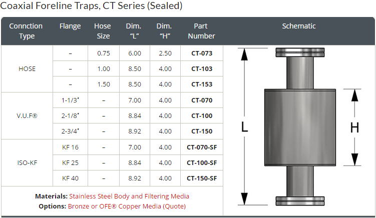 - Huntington CT Series coaxial foreline traps are designed to minimize oil backstreaming from roughing pumps. CT Traps are sealed, standard media is stainless steel with bronze or OFE® copper optional. Functioning at room temperature our traps are virtually maintenance free, reducing costs.