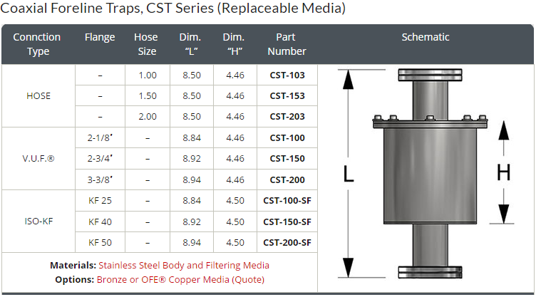 - Huntington CST Series coaxial foreline traps are designed to minimize oil backstreaming from roughing pumps. CST traps have a removable top for cleaning or replacement of media. Standard media is stainless steel with bronze or OFE® copper optional. Functioning at room temperature our traps are virtually maintenance free, reducing costs.