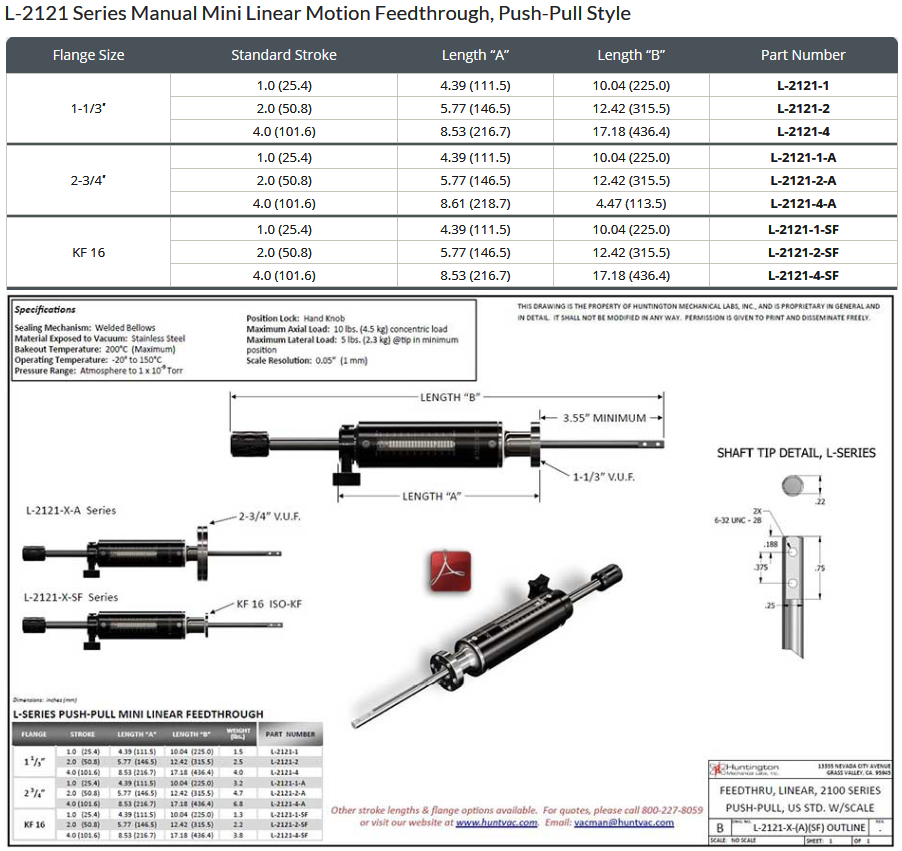 - Huntington’s Mini Linear Feedthroughs are available in multiple flange sizes and stroke lengths. All feature positioning scales and robust construction.