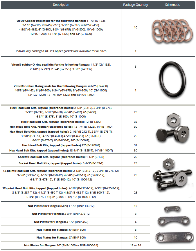 - Huntington carries a full selection of gaskets and hardware for all your flange mounting needs. OFE® Copper gaskets are available as a kit or individually as well as Viton® seals. Bolt kits cover all flange sizes and types and, depending on size, may include a choice of hex head, socket head or 12-point head styles.